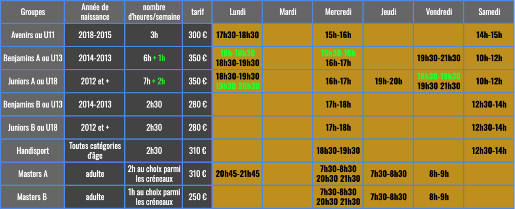 Les groupes sont constitués en fonction de l’âge du (de la) nageur (se) et en fonction du nombre de séances par semaine. Les U13 et U18 participants aux compétitions bénéficient également de 2 séances de PPG (Préparation Physique Généralisée, créneaux notés en vert sur le tableau)